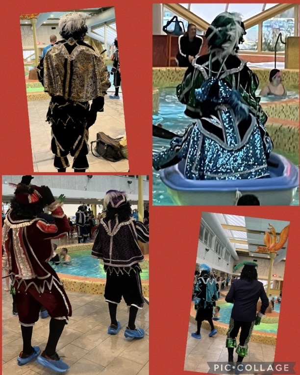 Pieten in een bootje, met zijn allen de polonaise en dansende Pieten op de kant.